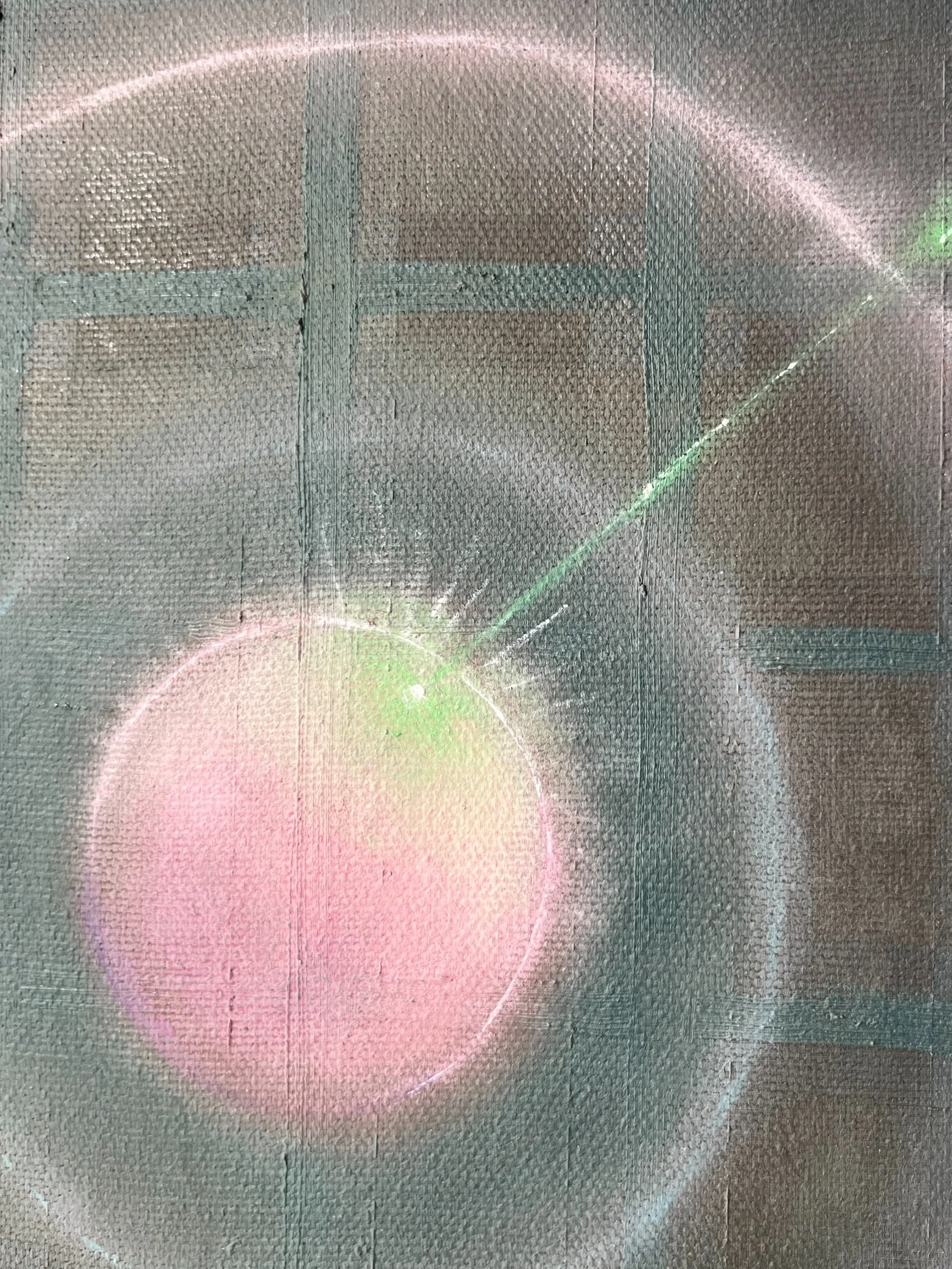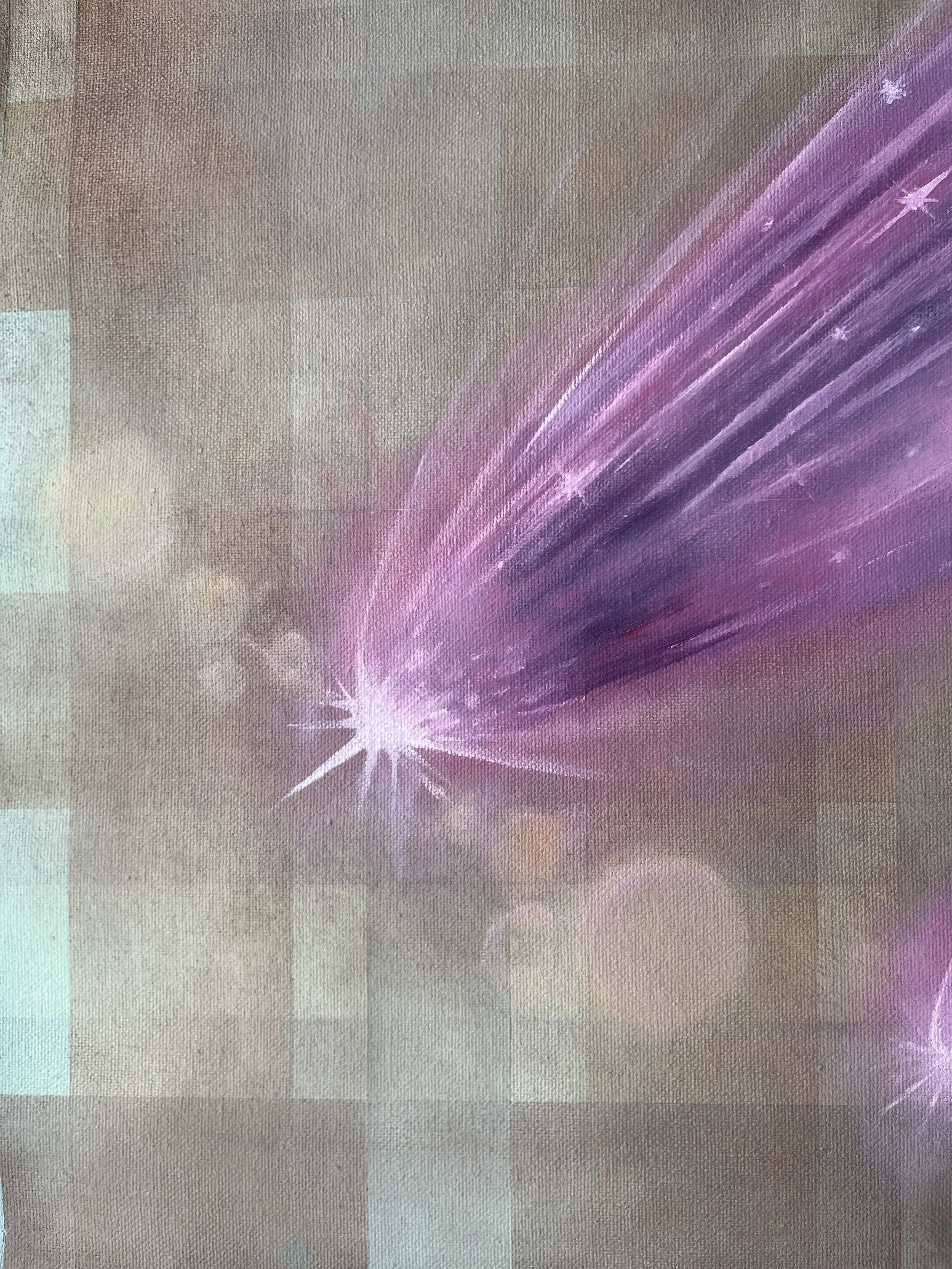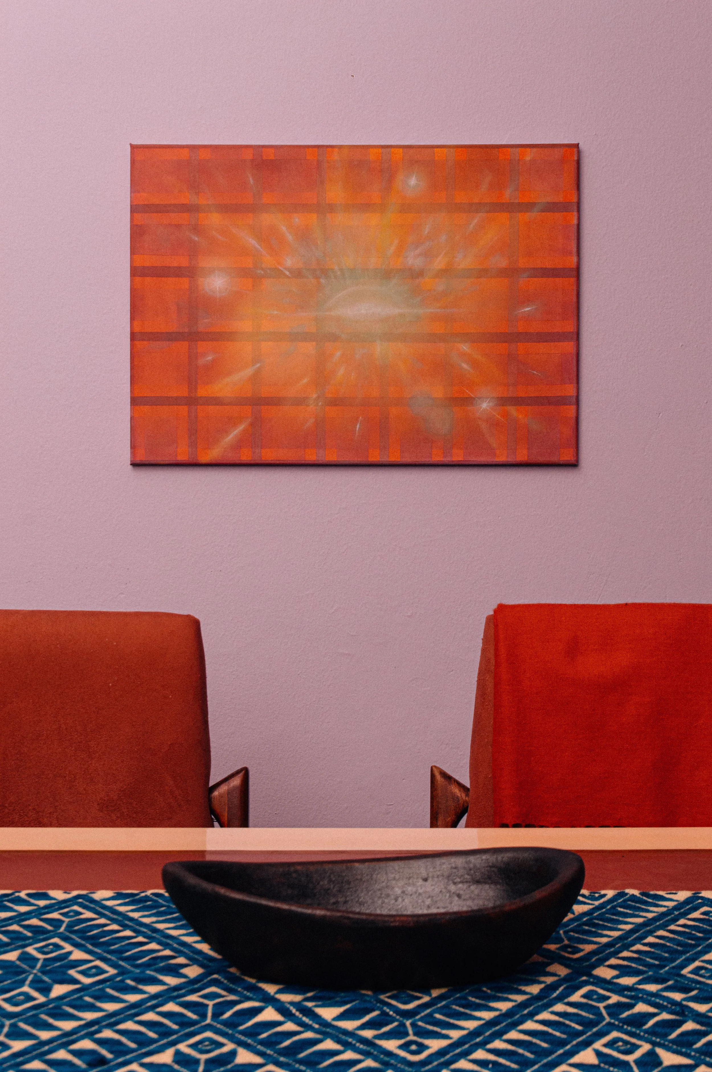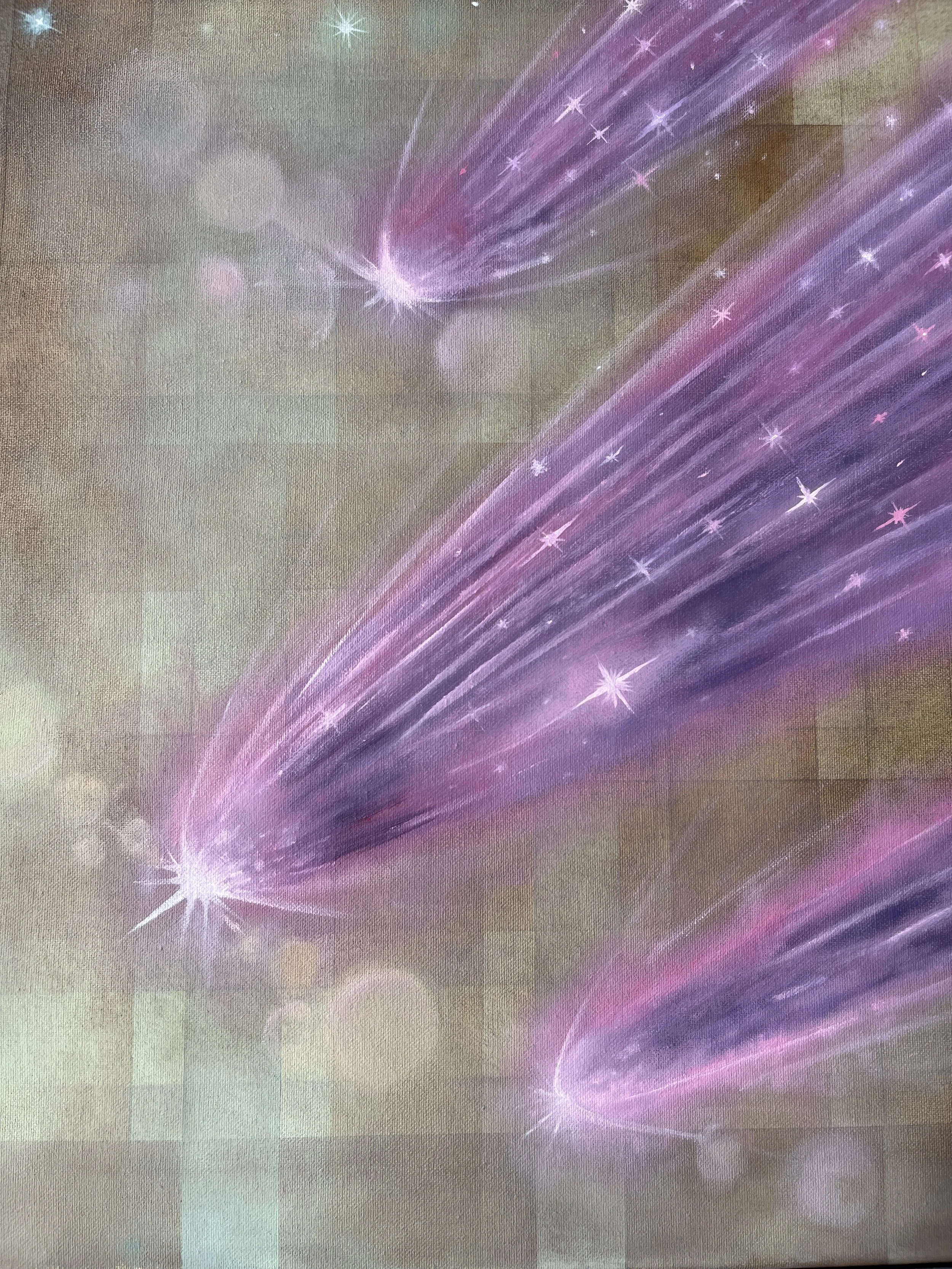 A través de una vibrante paleta de colores, esta serie de obras evoca fondos entrelazados con delicadas cuadrículas y esferas luminosas, simbolizando el fluir dinámico de la energía cósmica.