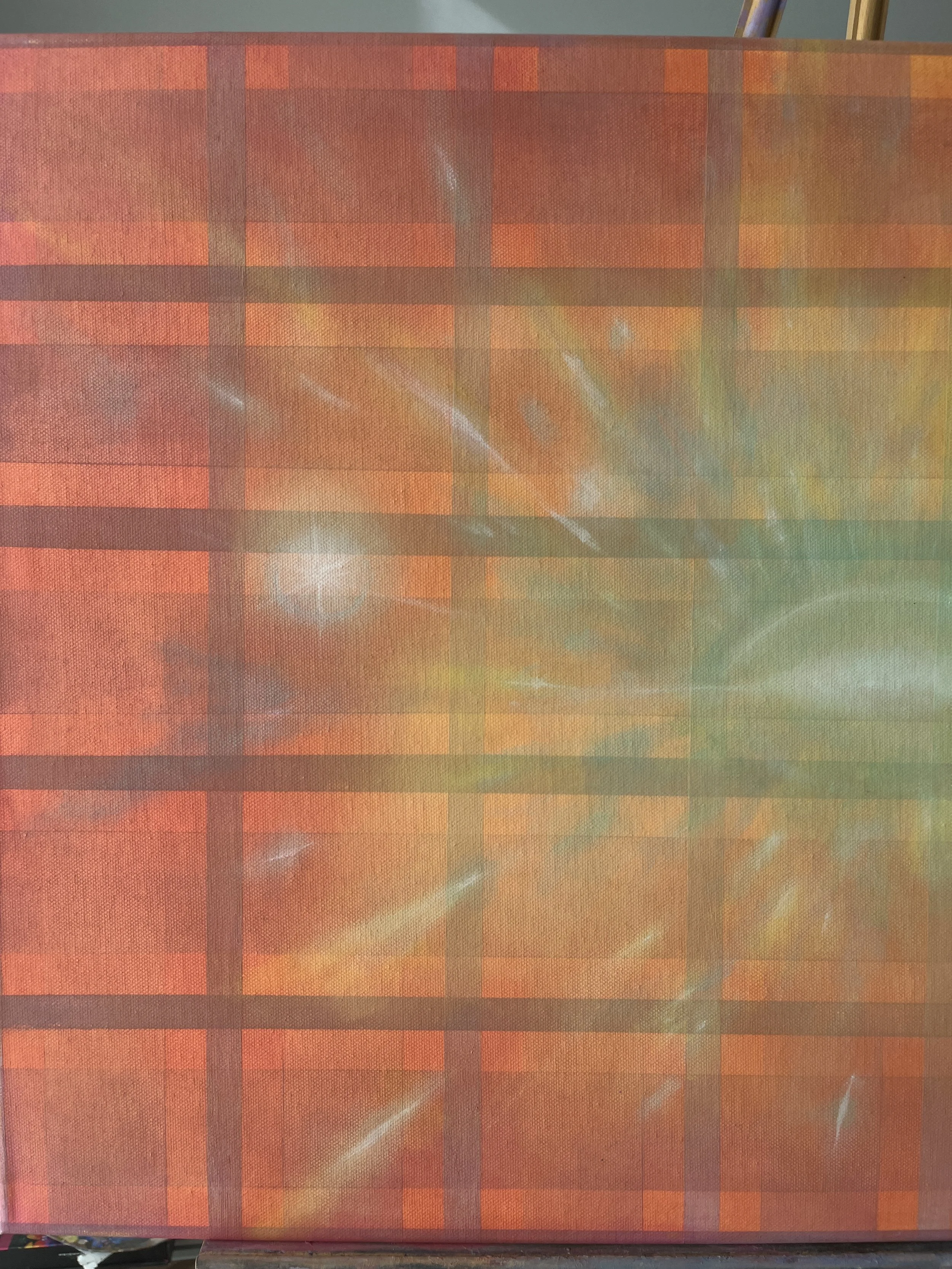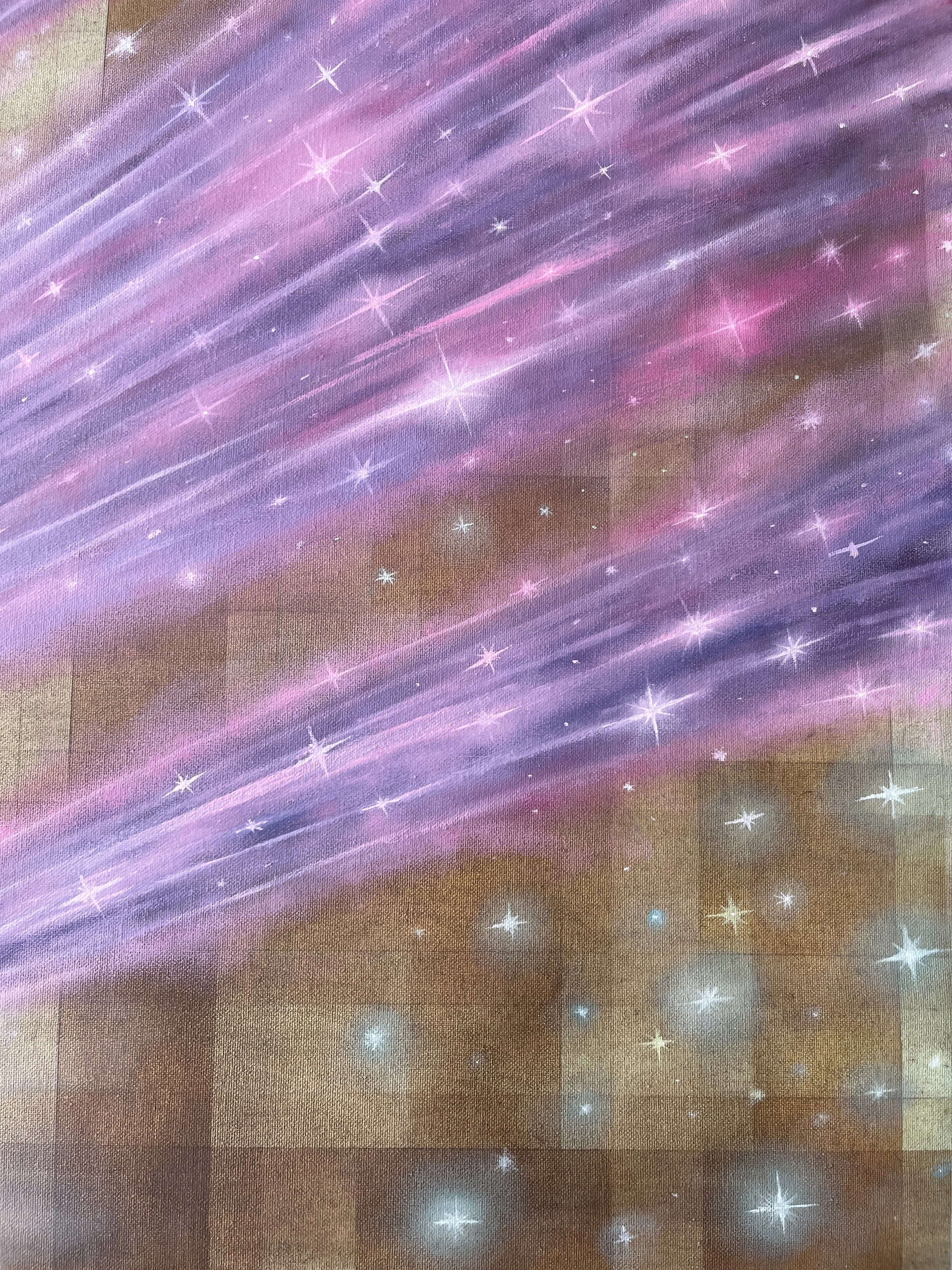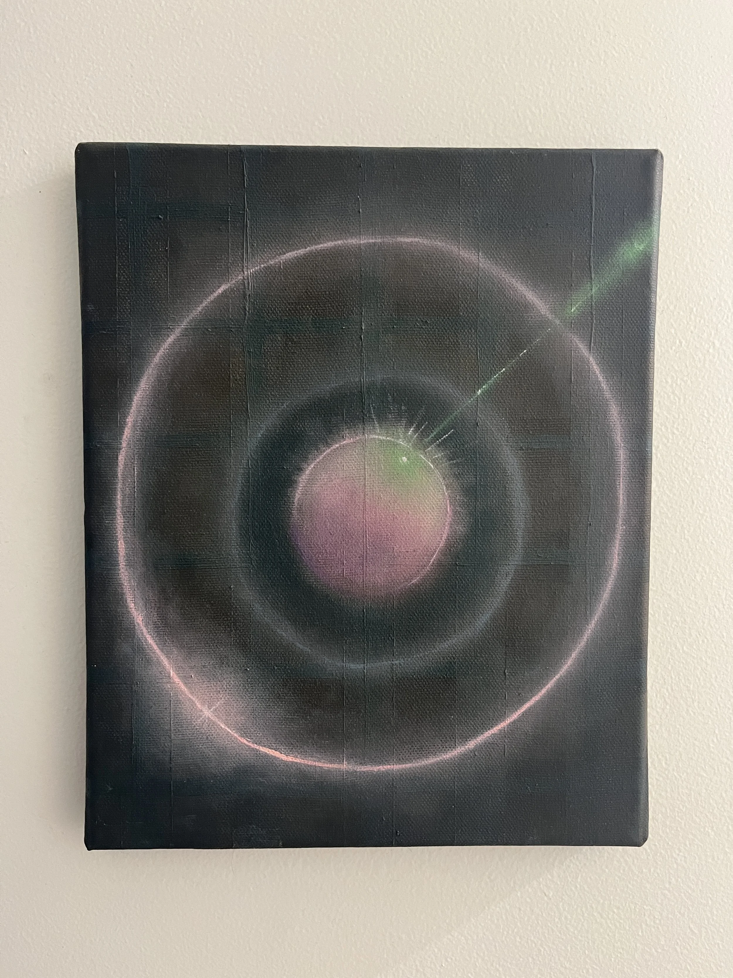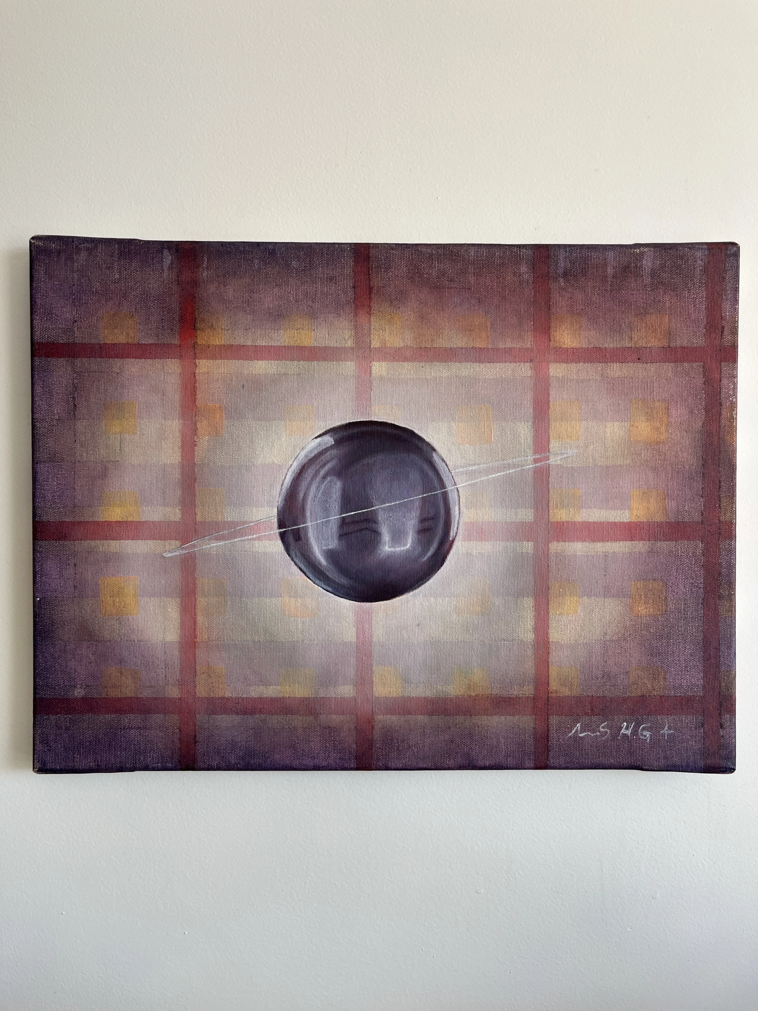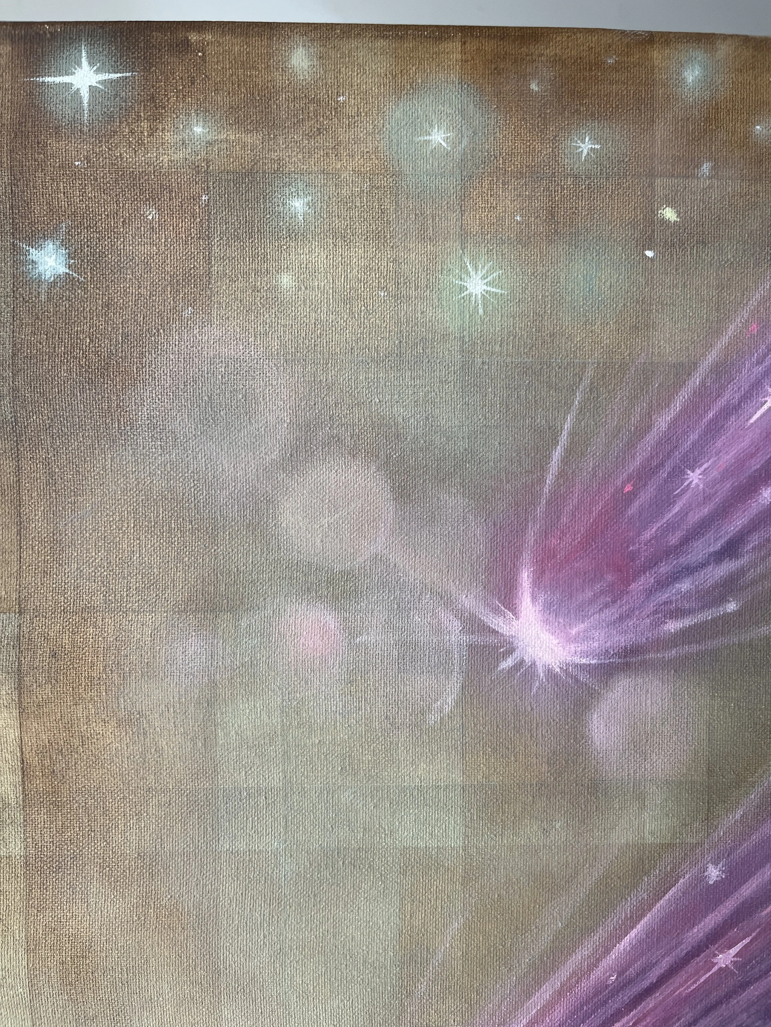 A través de una vibrante paleta de colores, esta serie de obras evoca fondos entrelazados con delicadas cuadrículas y esferas luminosas, simbolizando el fluir dinámico de la energía cósmica.